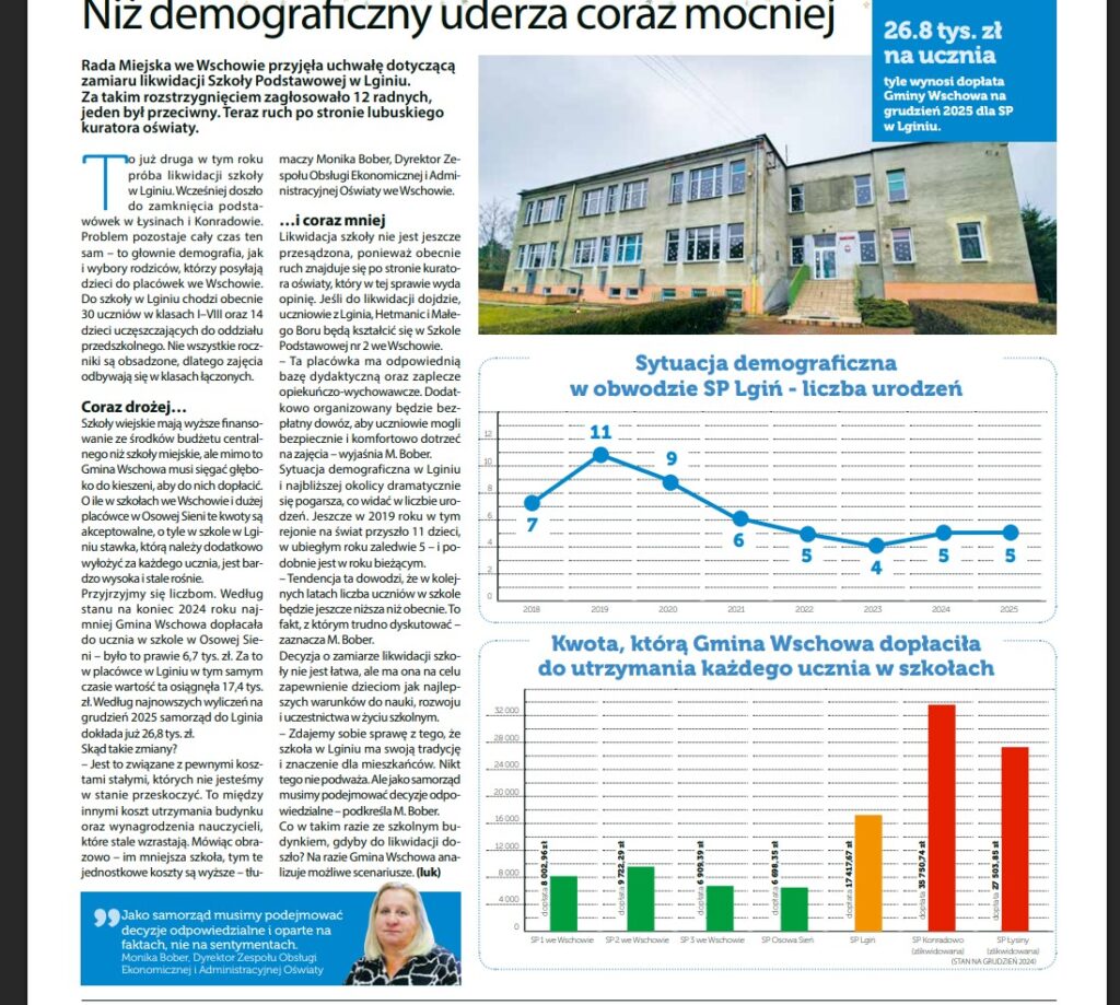 Tekst powyższy jest oczywiście fikcją. Do opracowania scenariusza likwidacji SP2 i przeniesienia uczniów do SP3 (im. Jana Pawła II) wykorzystano dane i argumenty z artykułu o likwidacji szkoły w Lginiu pt. „Niż demograficzny uderza coraz mocniej” Jestem ze Wschowy Grudzień 2025. W oparciu o informacje o liczbie uczniów, dopłatach i kosztach utrzymania placówek można dojść do wniosku, że taki scenariusz jest formalnie spójny i „uzasadniony” według kryteriów przyjętych przez obecną administrację Wschowy.